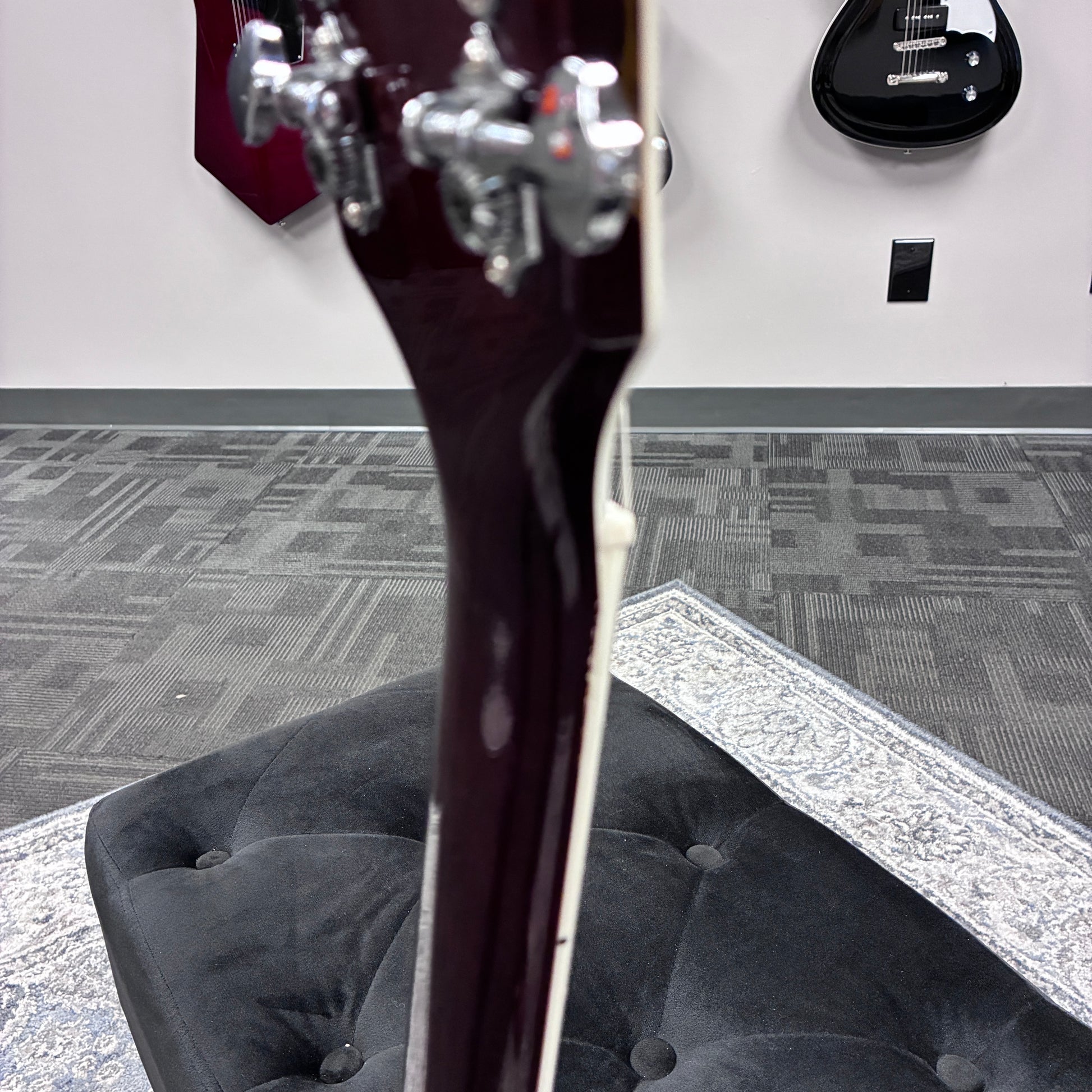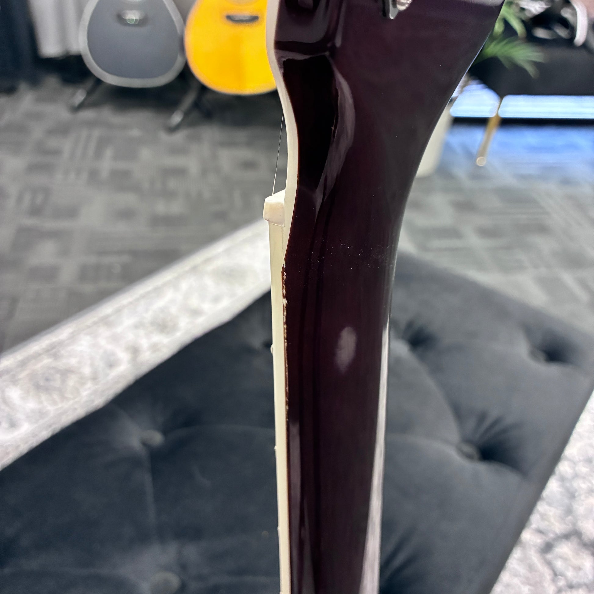 This guitar had a crack running along the fretboard by the nut. It has been repaired and sealed. This particular demo model previously had a tremolo fitted and has a couple visible screw holes near the tailpiece. It will ship set-up and ready to play!